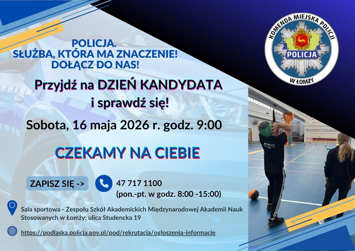 16 MAJA zapraszamy na ŁOMŻYŃSKI DZIEŃ KANDYDATA. Jesteś zainteresowany służbą w Policji? Nie wiesz jak wyglądają poszczególne etapy doboru? Nie wiesz czy dasz sobie radę? Przyjdź, zobacz i sprawdź się. Właśnie dla Ciebie przygotowaliśmy ŁOMŻYŃSKI DZIEŃ KANDYDATA. Czekamy w sobotę 16 MAJA, godzina 9.00 w sali sportowej Zespołu Szkół Akademickich Międzynarodowej Akademii Nauk Stosowanych w Łomży, ulica Studencka 19. Nie zapomnij się zarejestrować. #Policja-SłużbaKtóraMaZnaczenie